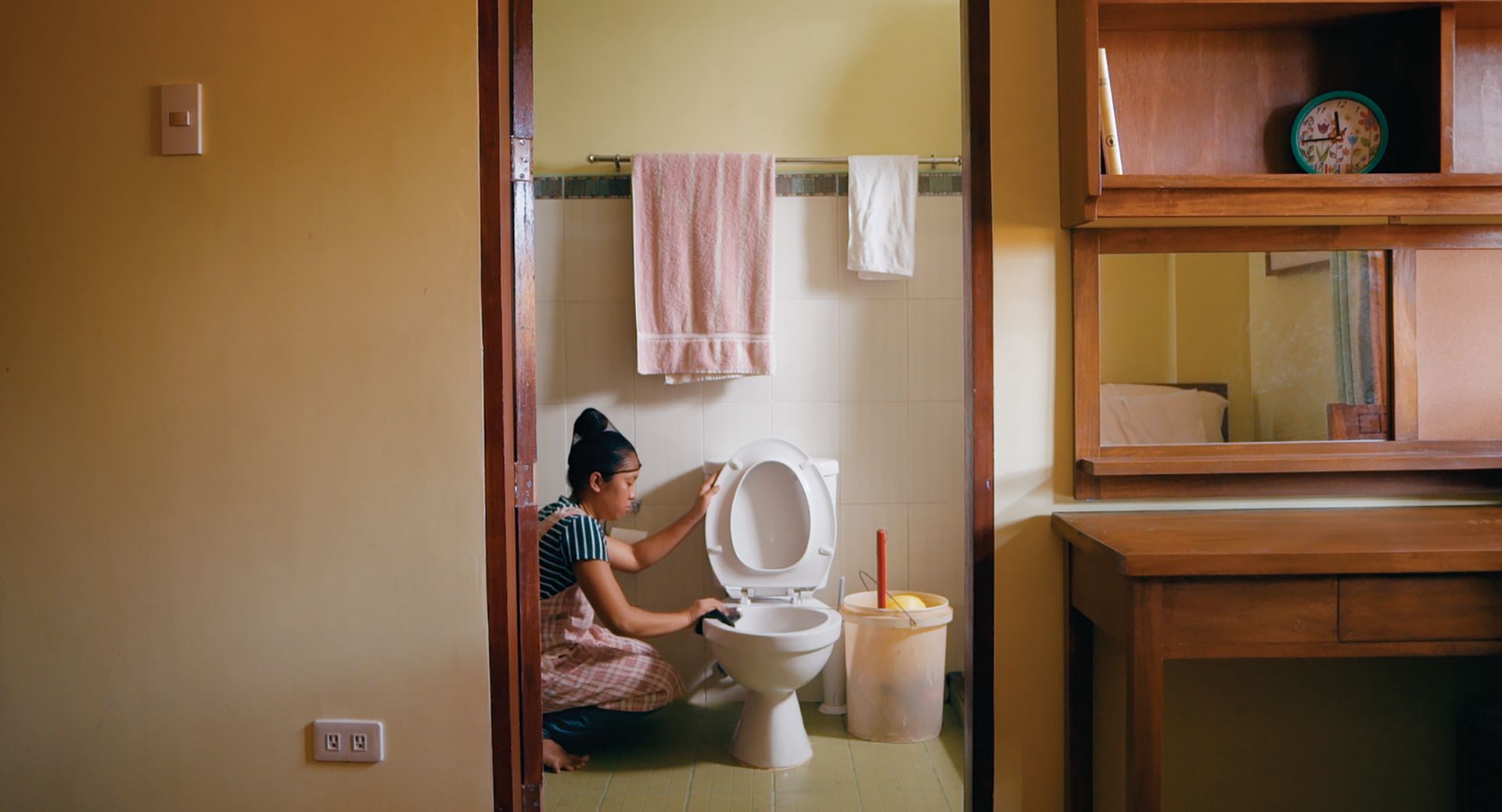 En Filipinas, miles de mujeres integran una industria de servidumbre para exportación. Desplegadas en diferentes países por dos años, estas mujeres constituyen una fuente importante de remesas promovida por el gobierno. Con un a mirada inquisitiva y valiente, Al extranjero retrata la preparación física y emocional a la que son sometidas en un centro de entrenamiento para trabajadoras domésticas transnacionales. Mientras las recreaciones se han vuelto un dispositivo común en el cine documental para indagar en los traumas históricos, en este caso Sung-A Yoon registra su uso por parte de la propia institución para adiestrar a las trabajadoras en los abusos y las exigencias a las que estarán sujetas. Esta suerte de puesta en abismo produce una ambivalencia que lleva al espectador a cuestionarse si las recreaciones son meramente profilácticas o si, por el contrario, escenifican la violencia y la vulnerabilidad cotidianas que atraviesan las labores de cuidado tantas veces invisibilizadas. Rodado sobre todo en interiores y con cámara fija, una secuencia atípica resume con nitidez las pulsiones del documental: una madre acompaña por última vez la siesta de su pequeño; tras incorporarse la vemos atravesar, mediante un travelling, un paraje portentoso. Hay un afuera y también hay una serie de afectos que se quedan atrás camino al extranjero. Tristemente, cuidar por contrato implica descuidar o delegar otros cuidados más propios. Por Julián Etienne, programador de Ambulante.